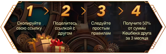 А в рамках реферальной программы можно получить до 50% кэшбэка от ставок, сделанных вашими друзьями. Отправляйте им ссылку для регистрации и забирайте ценные подарки на протяжении следующих трех месяцев, при условии, что они активно играют на деньги.
